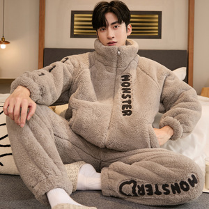 秋冬季珊瑚绒睡衣男士加厚加绒法兰绒保暖翻领大码青年家居服套装