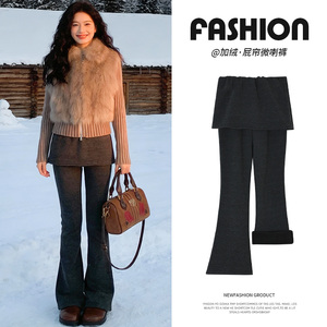 秋冬加绒韩国东大门假两件屁帘微喇叭裤女2025梨形身材显瘦休闲裤