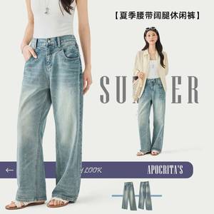 APO女装|2025新款水洗牛仔裤女夏宽松松紧腰百搭直筒潮流显瘦长裤