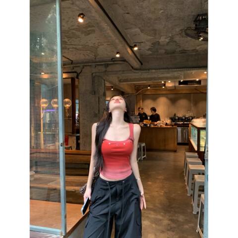 红色渐变u领吊带背心女夏2024新款美式复古性感辣妹修身短款上衣