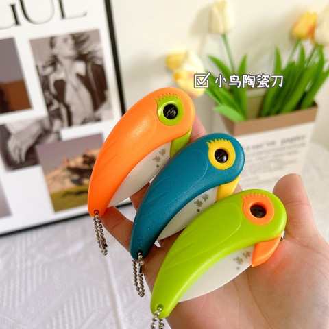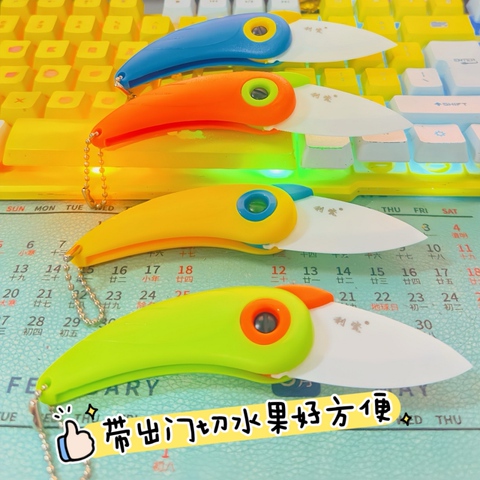 折叠式陶瓷水果刀。陶瓷主体不生锈,耐磨损耐氧化。鹦鹉造型,小巧便携,拆快递、切水果、户外露营必备!