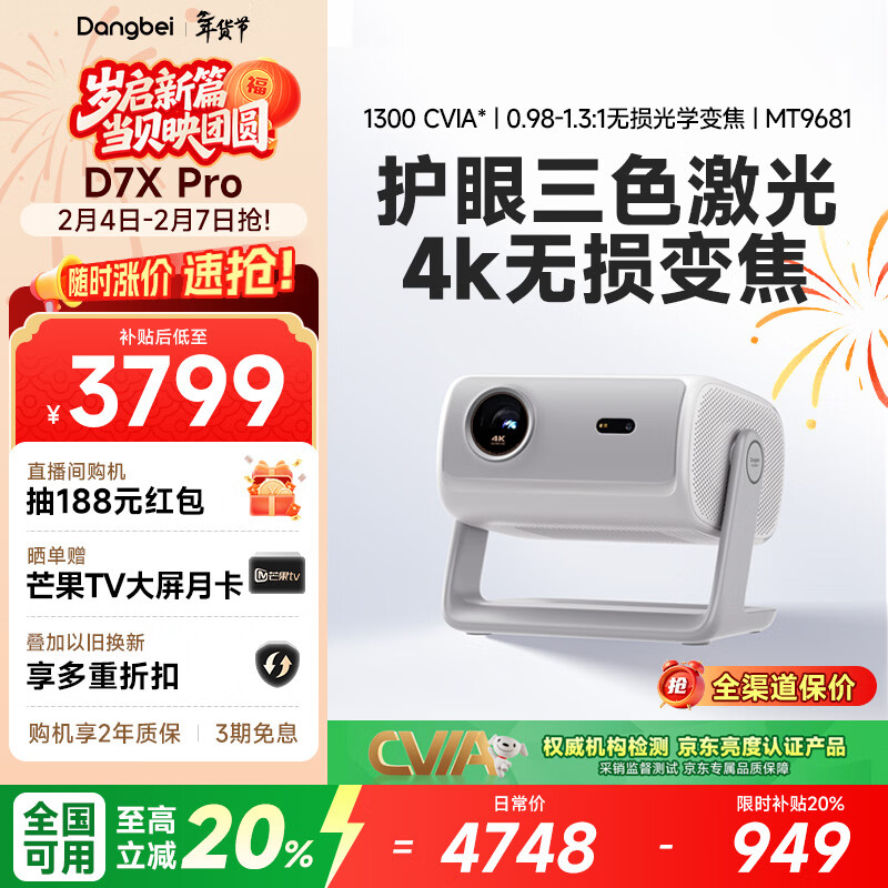 当贝 D7X Pro 4K三色激光投影仪家用 超高清家庭影院国家补贴20%(无损光学变焦 1600 ISO)