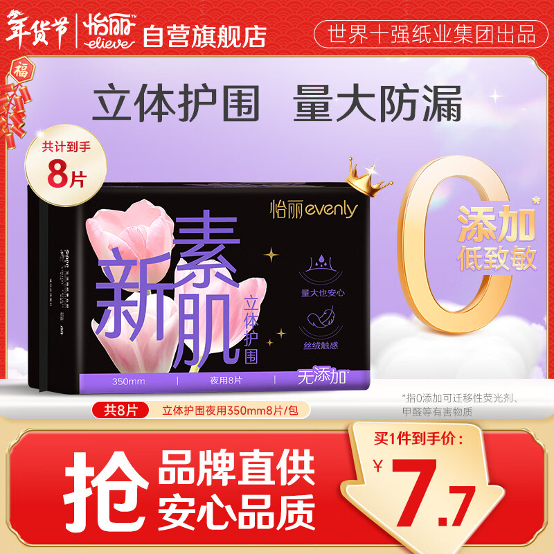 怡丽立体护围卫生巾棉柔透气超长夜用350mm8片京东自营官方旗舰姨妈巾