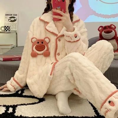珊瑚绒睡衣女冬季加绒加厚保暖法兰绒可爱熊猫少女外穿家居服套装