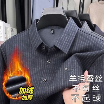 【羊毛+蚕丝】高档男士秋冬加绒长袖衬衫休闲条纹无痕衬衣保暖